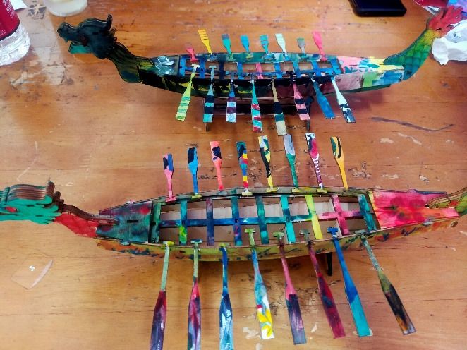 大龙舟由校内两名热心学生组装,小龙舟则由青菱社区的志愿者和小朋友合作拼装而成。拼装过程中,学生和小朋友集思广益、积极实践,将每个龙舟都拼得各有特色。龙舟着色则是由校内外的参与者接力完成,参与人数总计一百余人,学生覆盖全校各个学院。一百余次接力寓意传统文化的传承、微尘志愿服务的延续,反映了互助、进步的志愿者精神。