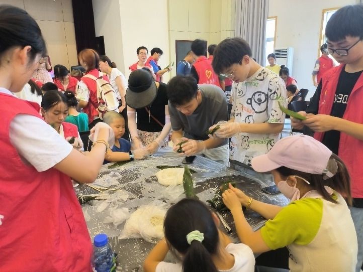 社区内的志愿者与小朋友们不仅一起做了游戏,还包了粽子。活动过程中小朋友们积极配合着活动的开展。志愿者们耐心地教小朋友们如何把糯米、豆沙、枣子等馅料包进粽叶里,然后用绳子扎紧。“我第一次包粽子,觉得很有意思,很开心可以吃到自己包的粽子。”统计2202班陈周妍说。社区还设置了摸石过河、萝卜蹲、编DIY五彩绳等一系列丰富的端午行游戏。