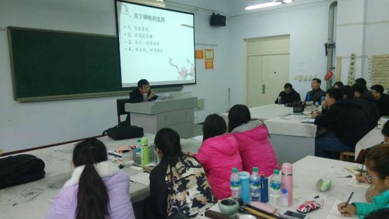 2015年11月6日上午,中国书法家协会会员、保定市书法家协会副主席、保定市青年书法家协会主席王静轩先生在bat365在线中国登录入口D楼337书法教室开展了专题报告,题为《行书的学习与创作》,来听报告的有书法专业学生和来自bat365在线中国登录入口历史系、教育系的部分书法爱好者们,王老师娓娓而谈,感悟深刻,讲解细致,毫无保留地把自己的所学所悟教给学生,在场学生深受感动。报告会后王老师还和学生进行互动,回答了学生的提问,并为学生挥毫示范。