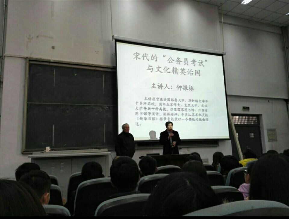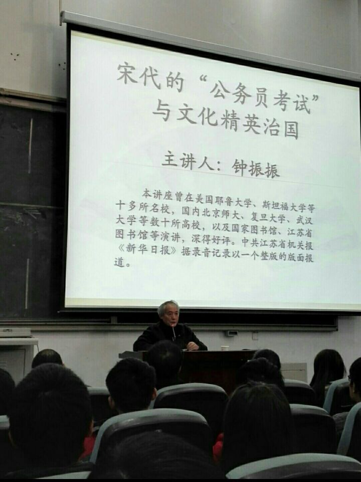 钟教授讲座的题目是“宋代公务员考试与文化精英治国D105报告厅座无虚席,钟教授整场报告以古鉴今、深入浅出、风趣幽默,赢得了学生的阵阵笑声和掌声,收到了良好的效果。