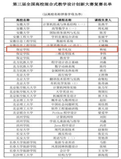 bat365官网秘书学专业韩旭老师申报的秘书礼仪混合式教学设计课程顺利通过大赛组委会评审,获优胜奖。