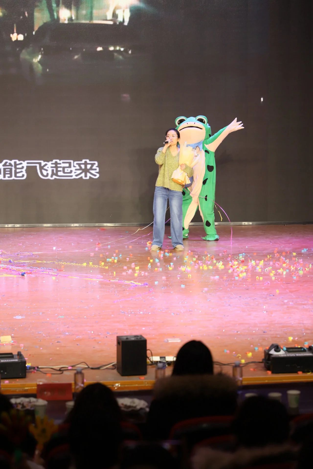 由邓雅琨、田佳音、高舒凡和赵馨同学带来的歌曲演唱也是十分的动听和欢快,可爱的小青蛙在台上活蹦乱跳,在郑蓿培老师出场后更是引得全场尖叫不已,师生同乐的氛围感染了在场的每一位观众。