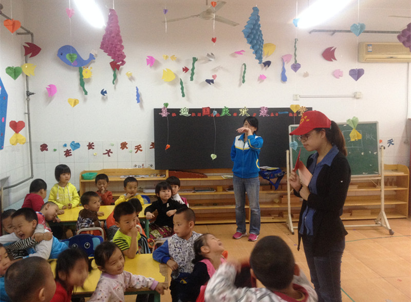 2014年9月29日下午,bat365在线中国登录入口中文系青年志愿者协会的同学们来到紫园小区小牛津幼儿园,开展了以“迎十一,共献礼”为主题的志愿活动。志愿者们为小朋友们讲述有关国庆节的小故事和小知识,小朋友们热情的与志愿者们互动,积极参与问答,气氛很活跃。志愿者们还与小朋友们共同作画。最后,志愿者们为幼儿园办了“祖国母亲,生日快乐”的主题板报,共迎即将到来的国庆节!