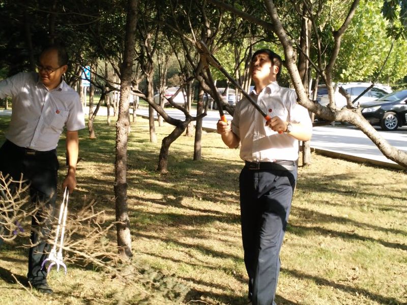 在党旗和系旗的引导下,党总支书记彭晓峰、副书记王春光带领大家来到服务地点。师生携带工具修剪树枝、清除草坪内宽叶杂草,配合默契,为校园环境的综合整治贡献了自己的力量。