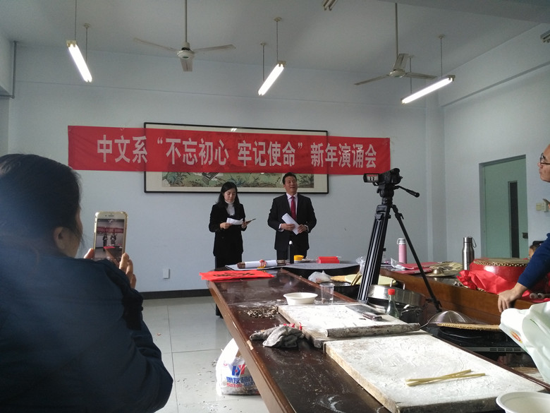 2018年1月10日下午,中文系党总支组织全系教工举行“不忘初心 牢记使命”新年演诵会。老师们用朗诵、三句半、京剧、歌曲等形式歌颂党,歌颂党的十九大。