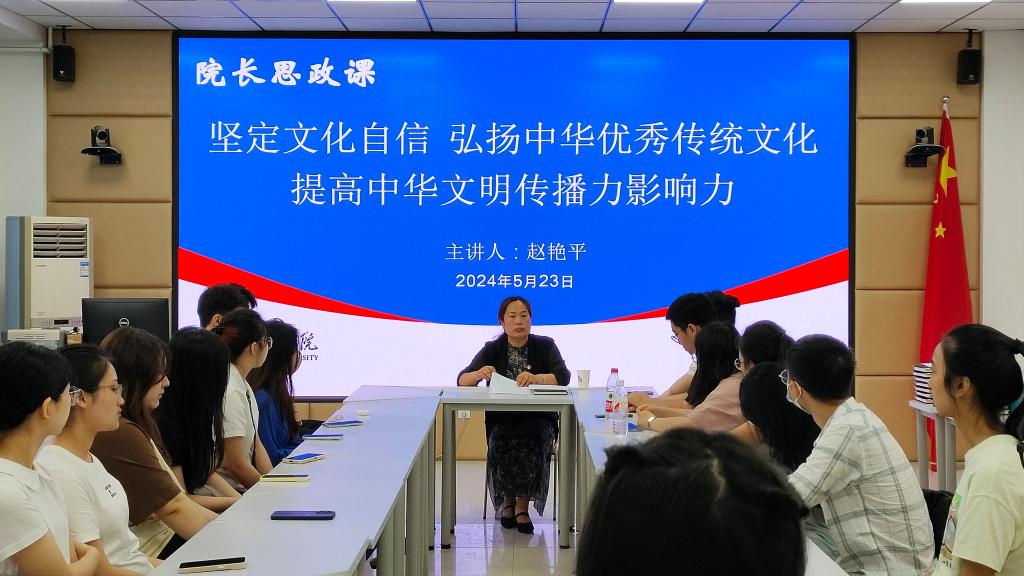课上,赵院长从坚定文化自信、弘扬中华优秀传统文化与讲好中国故事、提高中华文明的传播力影响力三方面进行授课。她希望同学们以传承弘扬中华优秀传统文化为己任,勇于担当,多做贡献。