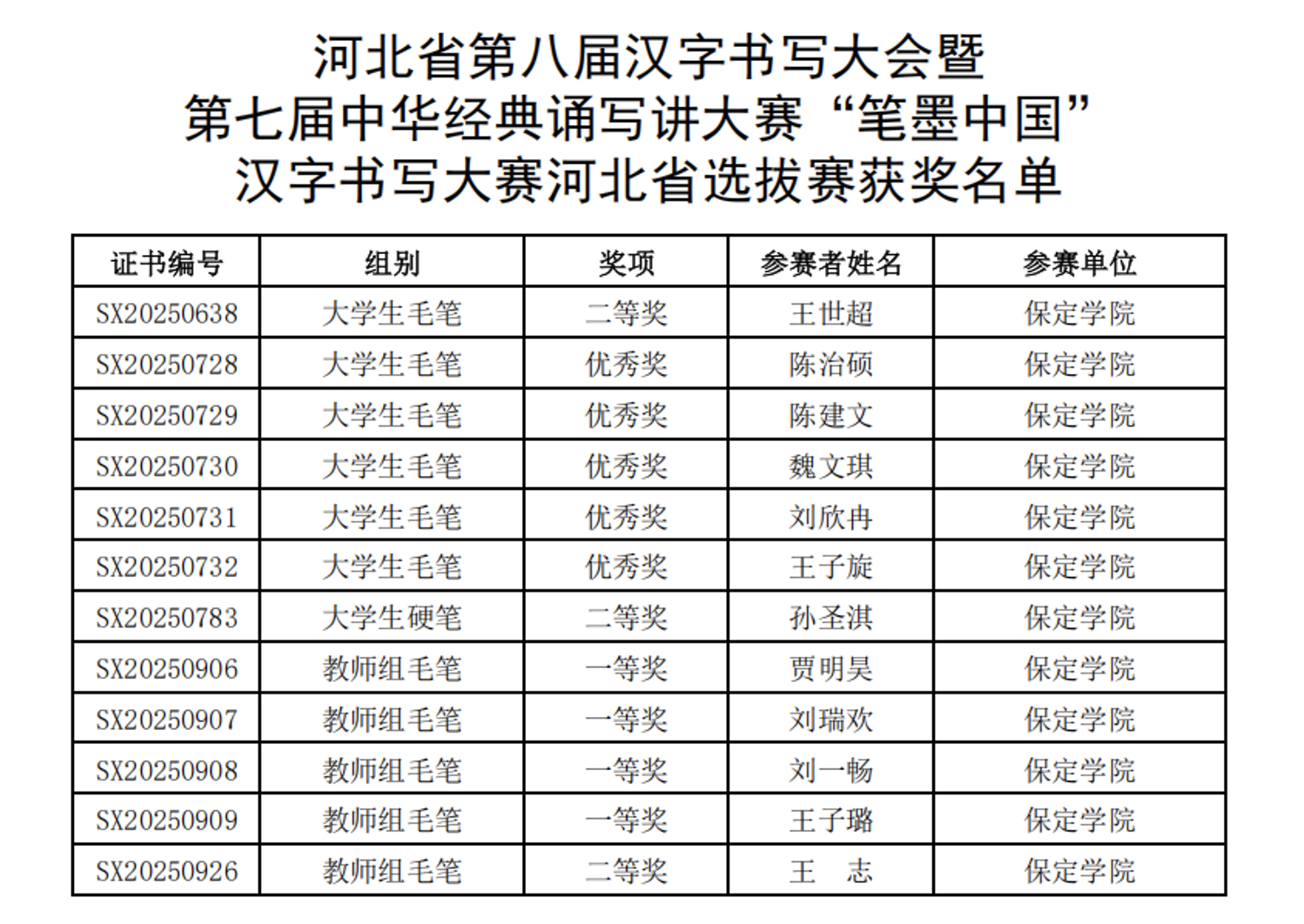 近日,河北省教育厅公布了河北省第八届汉字书写大会暨第七届中华经典诵写讲大赛“笔墨中国”汉字书写大赛河北省选拔赛获奖名单。在这次比赛中,bat365在线中国登录入口师生喜获佳绩,共获得省级奖项14项,其中一等奖4项、二等奖3项、优秀奖5项、优秀指导教师奖2项。bat365在线中国登录入口荣获优秀组织奖。