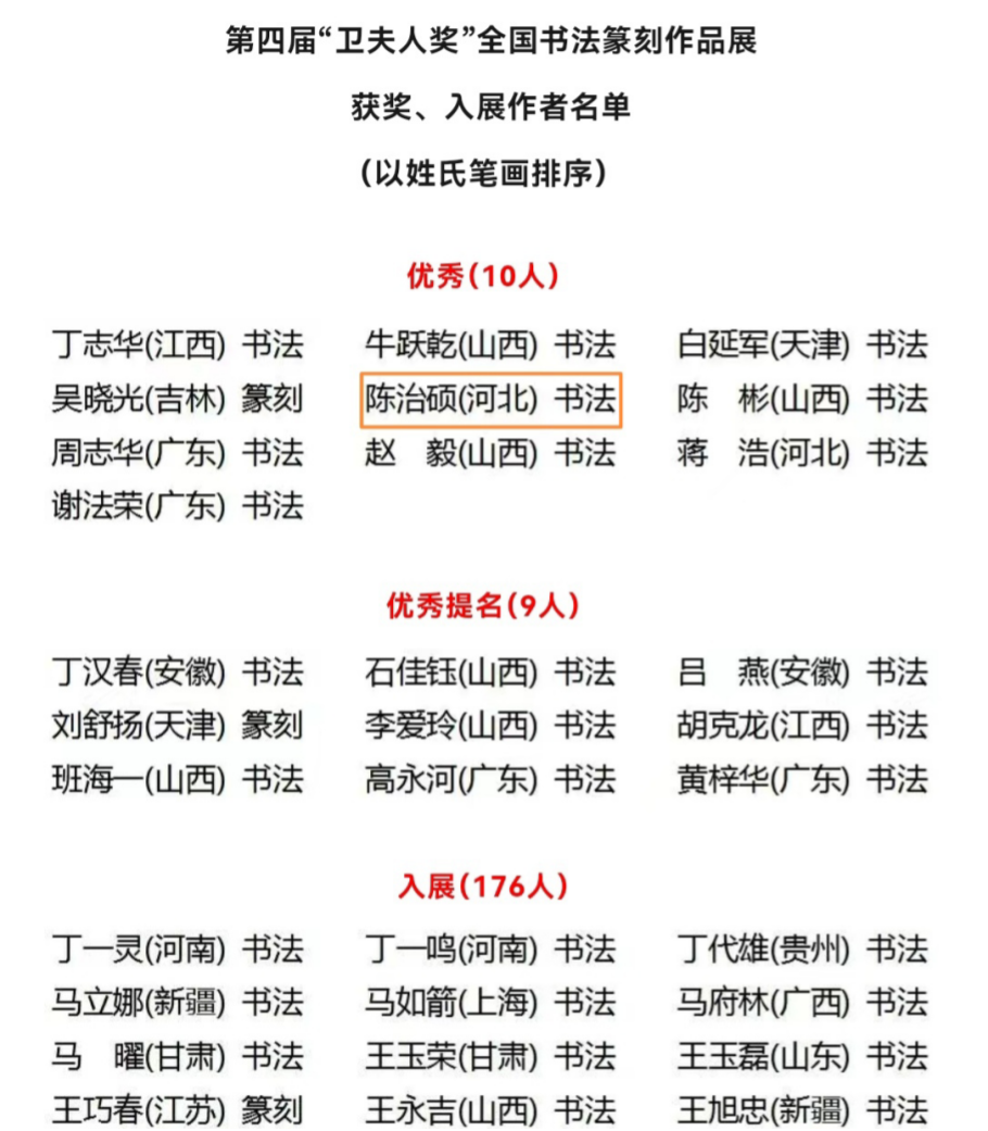 bat365在线中国登录入口书法学专业学生陈治硕荣获第四届“卫夫人奖” 全国书法篆刻展优秀作品奖