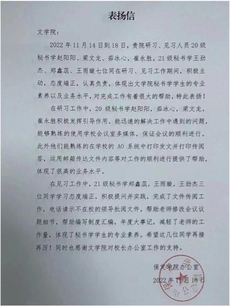 同学们的专业实践还得到了见习研习工作岗位领导的认可,多个部门通过电话或写表扬信等形式感谢同学们的踏实付出,并对同学们的专业能力给予高度认可。