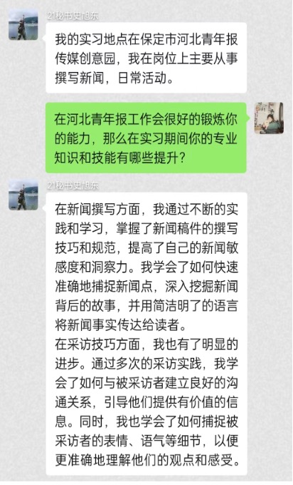 史旭东同学在保定市河北青年报传媒创意园工作,主要负责撰写新闻、组织活动等工作。实习以来,他的新闻撰写水平和采访技巧得到明显提升,他也在工作中深刻体会到本次实习的重要意义。他期望以后能全程参与新闻采编实践活动,提高自己的实战能力,利用实习机会掌握更多与新媒体相关的技能,为更好地适应新闻环境下的秘书工作打下基础。