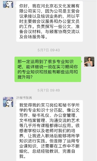 张茜同学在河北京石文化发展有限公司工作,日常负责撰写公文、准备会议材料及会场服务。在会议服务工作中也会遇到与顾客沟通不顺畅的情况,也受到过领导的批评,当然也得到了领导的大力帮助,最终解决了各种各样的困难。尽管工作有些波折,但正是这些不顺利让她各方面的能力有了很大提升。她体会到工作要关注细节,努力做到尽善尽美,把工作中的不足升华为经验,不断地完善自我。