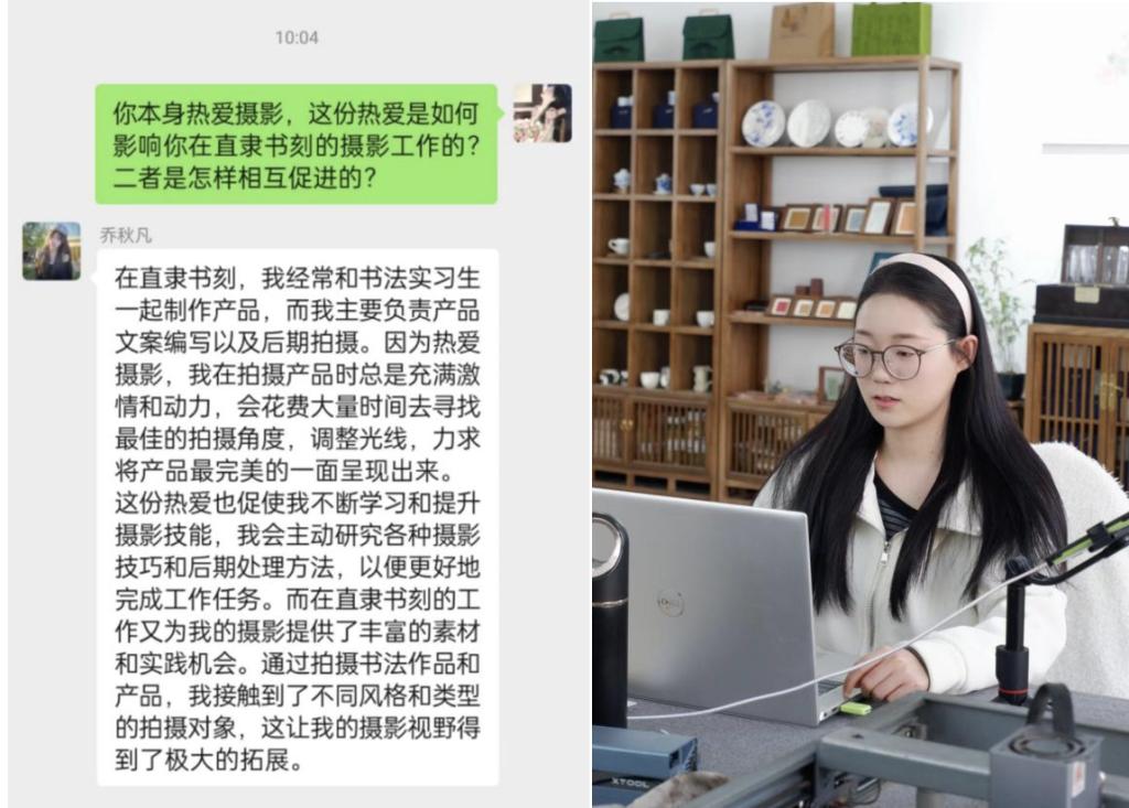 乔秋凡同学在bat365在线中国登录入口直隶书刻工作室实习,工作包括文案编写、摄影剪辑与宣传策划等。因热爱摄影,她在拍摄书法篆刻作品时满怀热忱,不断钻研,追求完美。乔秋凡同学表示,这段实习经历提升了自己的品牌宣传推广、摄影摄像和剪辑编辑能力,为以后的职场发展积累了宝贵经验。