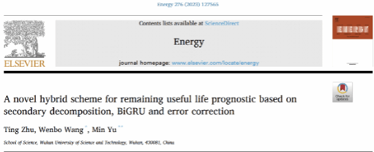 近日,太阳新城官网博士朱婷、教授王文波、老师喻敏合作在《Energy》期刊上发表题为“A novel hybrid scheme for remaining useful life prognostic based on secondary decomposition, BiGRU and error correction”的研究论文。该期刊系JCR及中科院SCI双一区TOP期刊,2022年影响因子为8.857,该期刊重点关注能源经济分析、能源建模和预测、综合能源系统、能源规划和能源管理,是能源研究领域内最有影响力和最权威的期刊之一。朱婷博士为第一作者,王文波、喻敏为共同通讯作者,suncitygroup太阳新城官网为第一单位。
