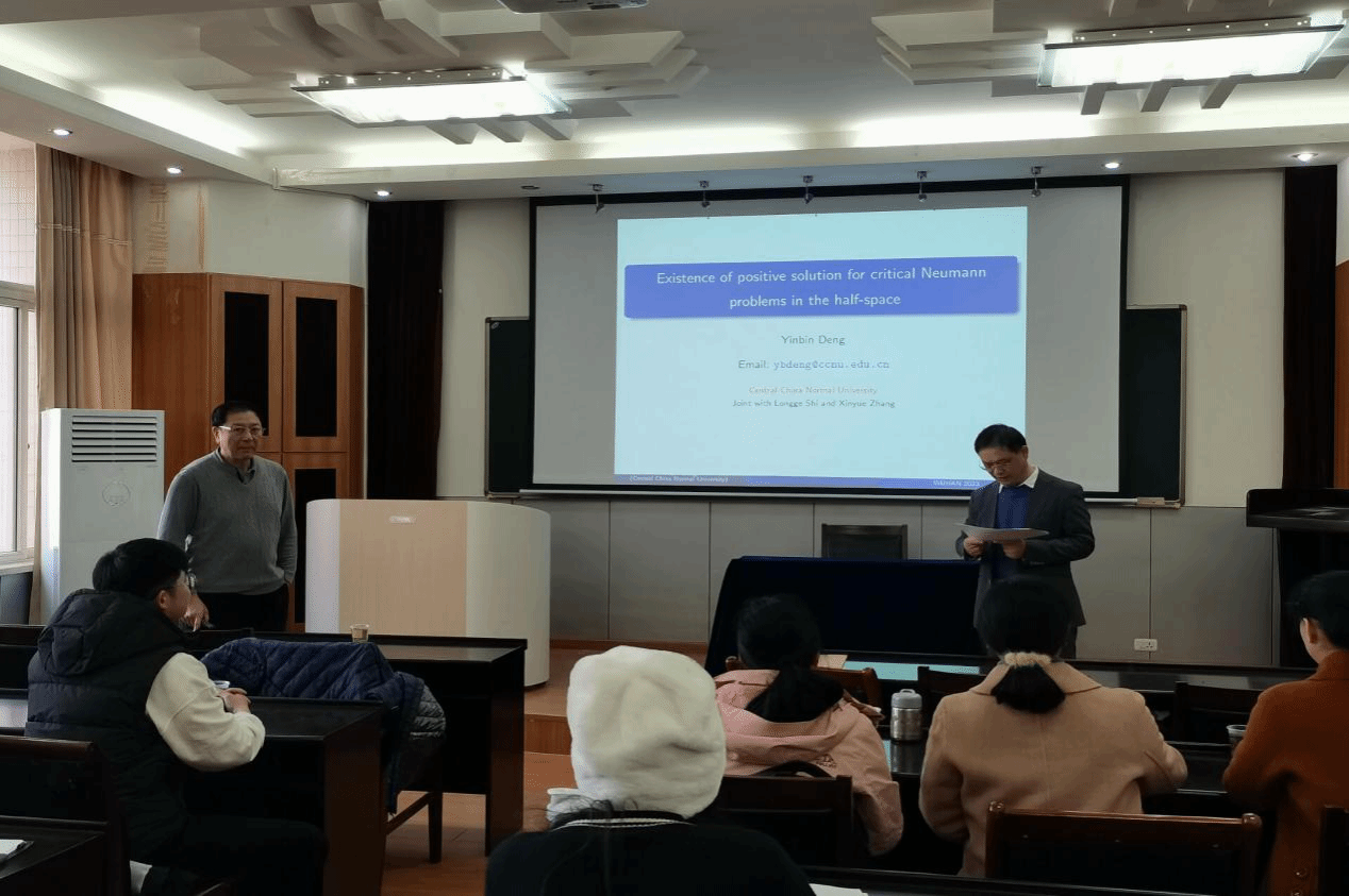(通讯员suncitygroup太阳新城官网)受太阳新城官网的邀请,华中师范大学邓引斌教授、李工宝教授于12月5日下午15:30,来太阳新城官网进行学术交流。邓引斌教授做了题为“Existence of positive solution for critical Neumann problems in the half-space”的专题报告,李工宝教授结合本科生课程《实变函数》给参会师生做了报告。本次报告会由太阳新城官网院长丁义明主持,数学与统计系教师代表和数学专业硕士生参加了此次报告会。