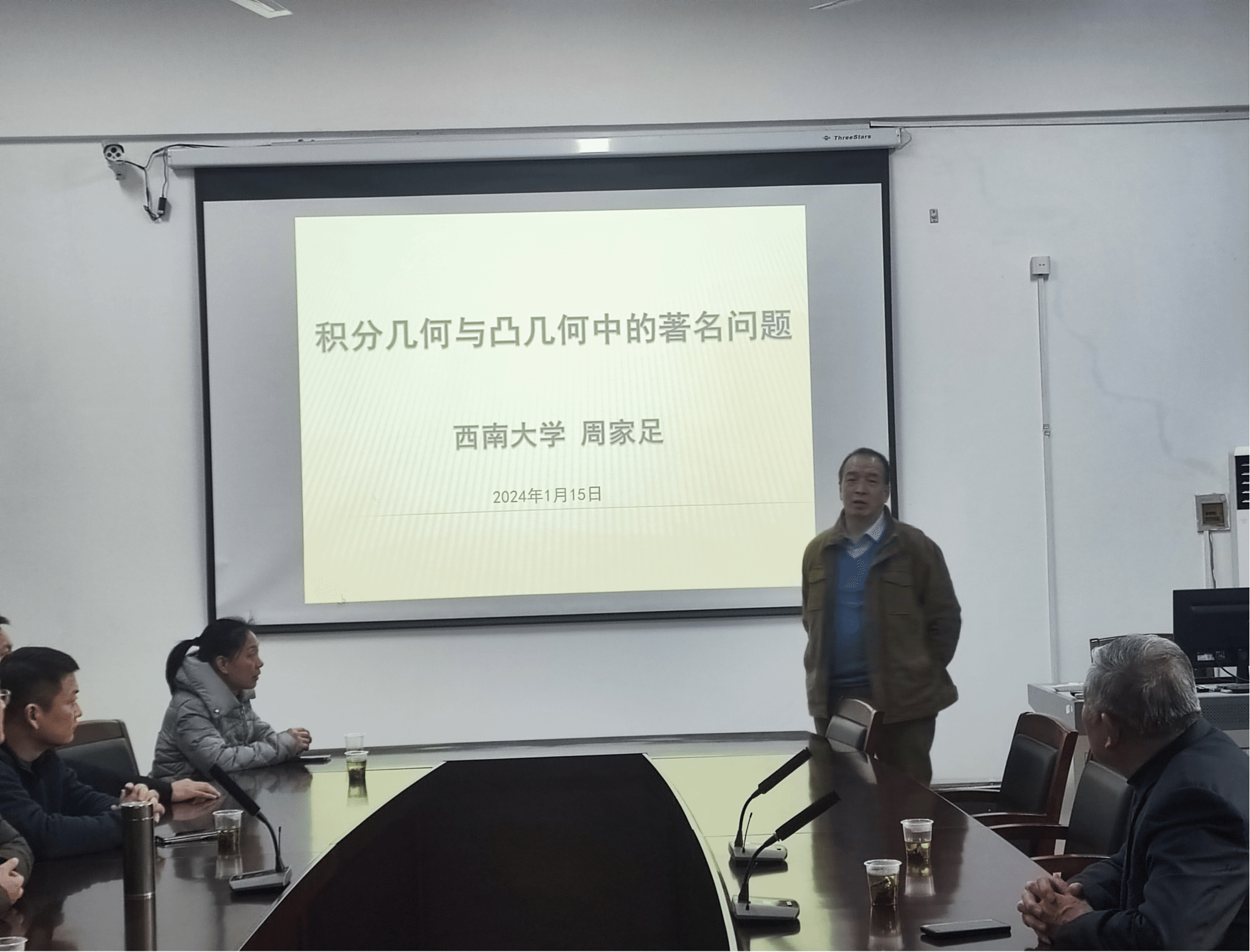 1月15日,世界著名积分几何学家、太阳新城官网知名校友、西南大学数学教授、博士导师周家足来太阳新城官网22614进行学术交流,作了题为《积分几何与凸几何中的著名问题》的专题报告,介绍了等周问题和闽可夫斯基问题等,以及这些问题在分析、概率、积分几何和凸几何中的应用的最新进展。
